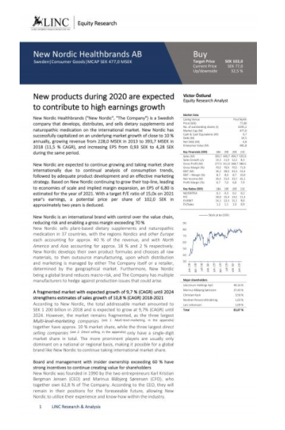 In this equity report, analyst Victor Östlund takes a deep-dive into New Nordic Healthbrands (or “NHH”). NHH develops, distributes, and sells dietary supplements and naturopathic medication around the globe. Our analyst, Östlund, expects NHH to keep winning market shares over the two coming years by leveraging a highly effective marketing strategy and innovative development department.